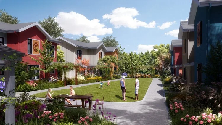 The Burien Village is a cooperative that includes 27 beautiful ecoCottages. Residents own a share of the village through a limited equity cooperative. Community amenities include gardens, play areas, gathering areas, and open space. A welcoming beacon for the village will be the common house with a large kitchen, dining/meeting space, and shared laundry facilities. Two main bus lines connect the village to local businesses and regional transit hubs. Working closely with the City of Burien, ecoTHRIVE Housing secured a zoning variance to develop a cottage village in a single-family residential zone through Burien’s Affordable Housing Demonstration Program. This collaborative effort between a community-led developer and a local jurisdiction highlights the potential for innovative solutions to address pressing social challenges.